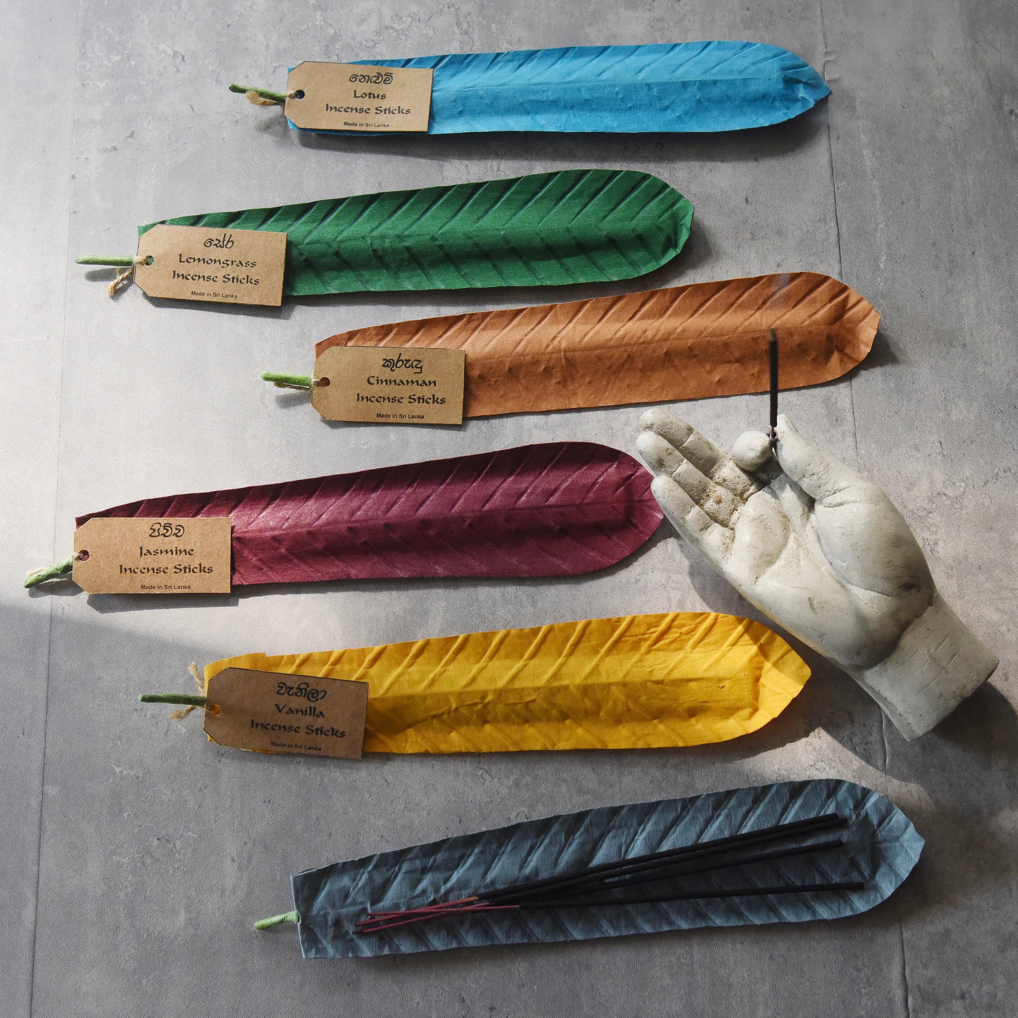色とりどりのバナナリーフ型クラフトケースに入った、Made in Sri Lankaのスティックインセンス。