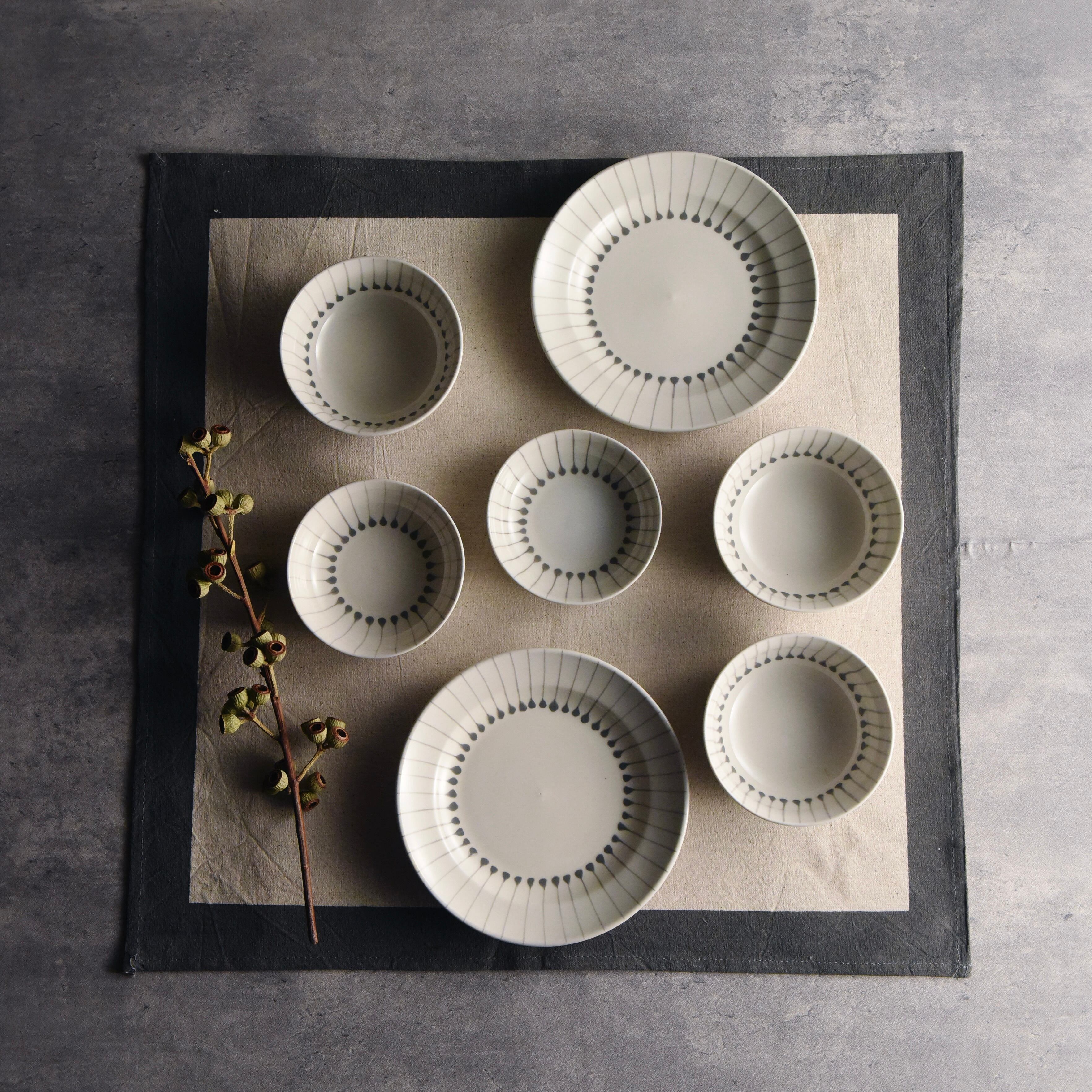 やさしい色味のグレーの釉薬を使い、しずく型と細いラインを組み合わせたシンプルな模様。