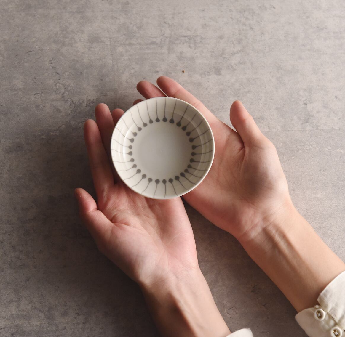 やさしい色味のグレーの釉薬を使い、しずく型と細いラインを組み合わせたシンプルな模様。