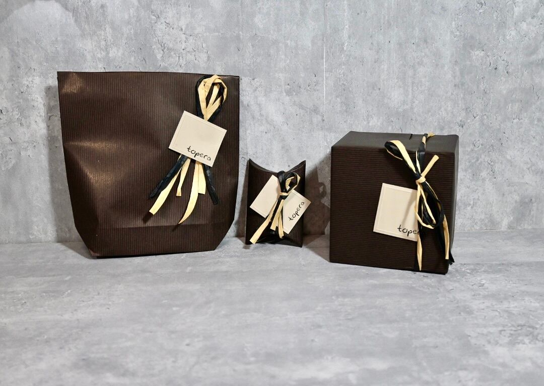 ブラウンのラッピングペーパーに、ベージュとブラックのラフィアリボン。