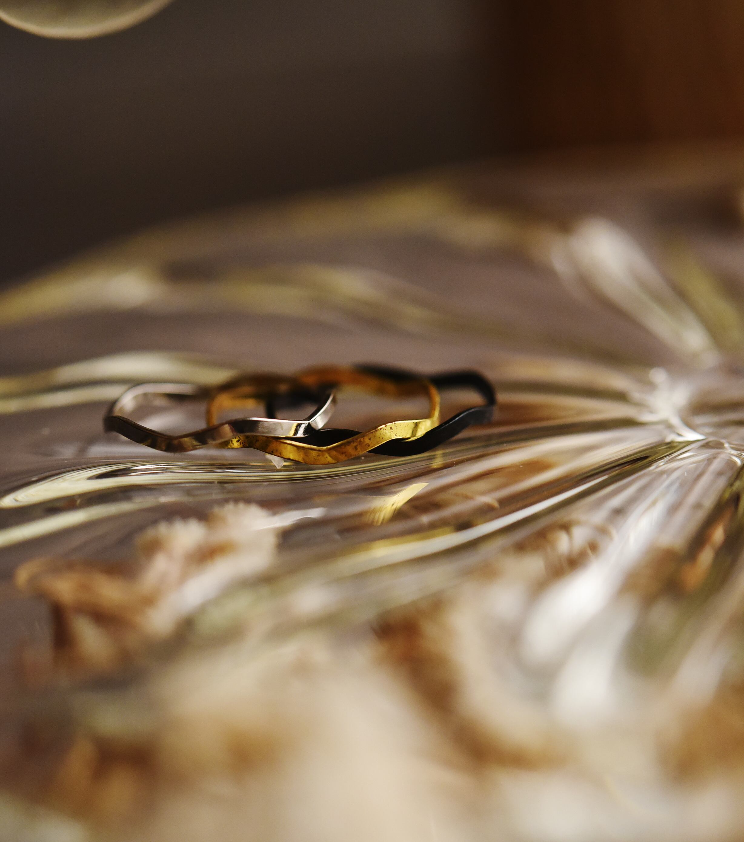 ゴールド、シルバー、ブラックメタルの3本セットなので、ひとつの指に3連リングとしてつけたり、2本と1本で分けて別の指につけたり、その日の気分でアレンジが楽しめます。
