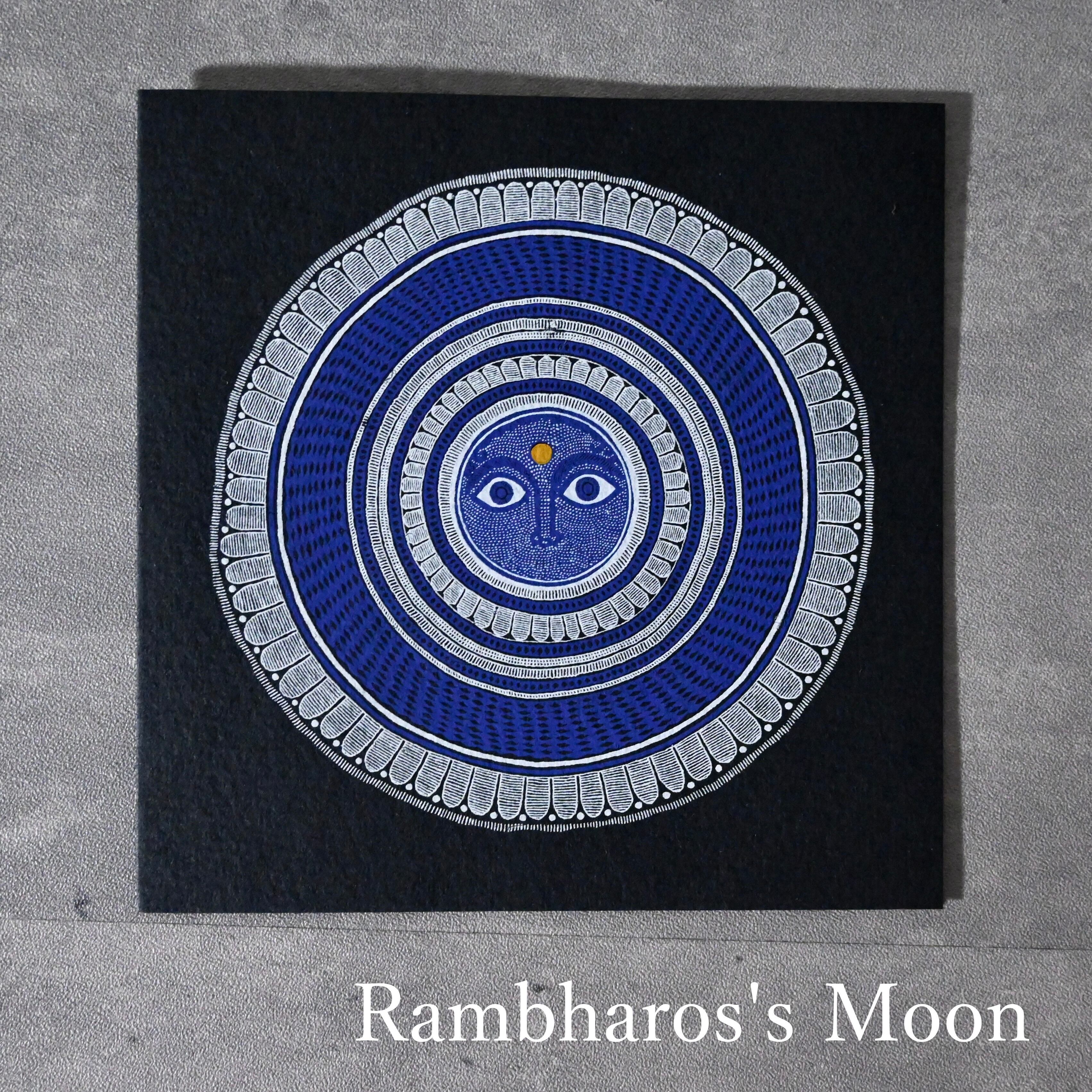 主に自然やヒンドゥー教のモチーフを描く、ミティラー画(ミティラーアート)のスタイルで描いた月「Rambharos's Moon」。