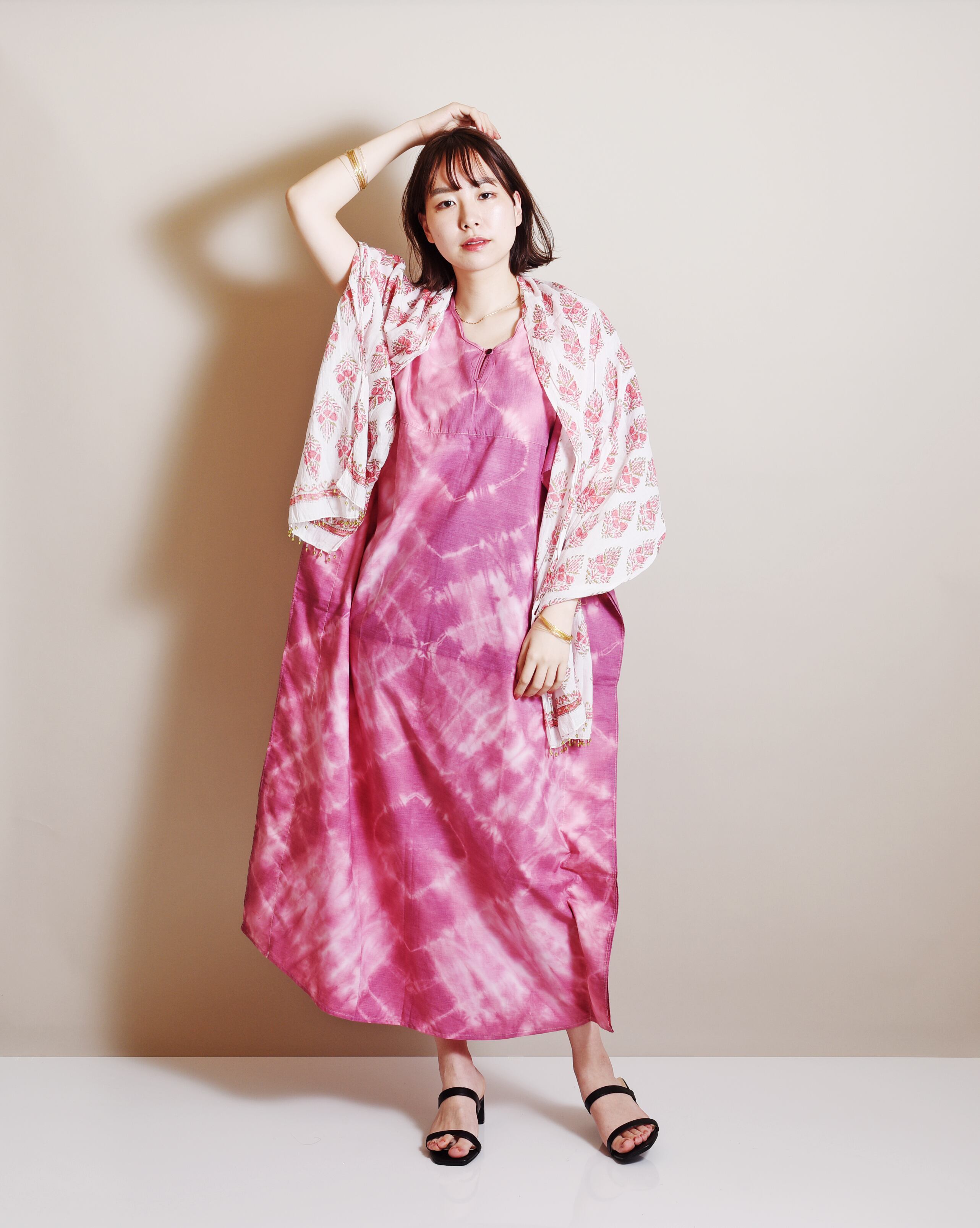 大胆なタイダイ染めを全身に纏い、ちょっとエスニックな雰囲気で着こなせるカフタンワンピースです。